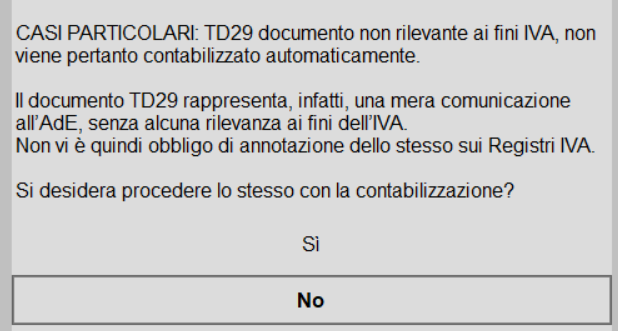 Considerata la natura meramente comunicativa del documento TD29, la procedura non effettua la contabilizzazione automatica dello stesso.
