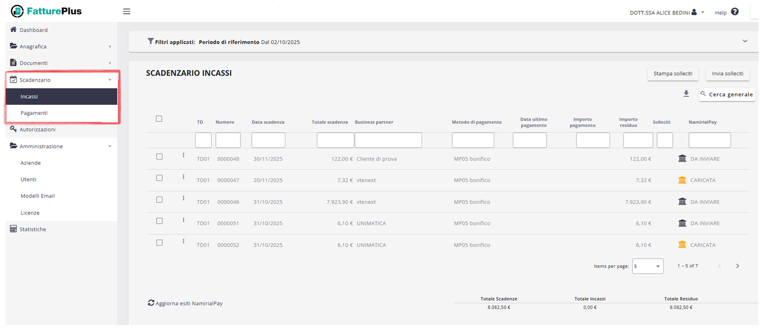 È disponibile come sezione indipendente Scadenzario nel menu laterale di sinistra, con due sottovoci: