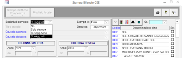 - STAMPA BILANCIO CEE (scelta 01-02-05) che permette di valorizzare i valori da conto economico e alcuni valori di stato patrimoniale;