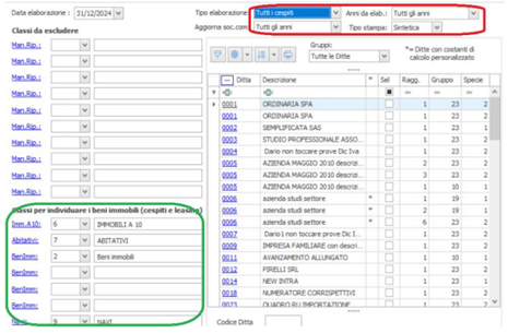 Nella parte di sinistra della maschera (riquadro verde) devono essere indicate le specifiche “Categorie di beni” precedentemente create e agganciate ai cespiti. Questo passaggio garantisce la corretta valorizzazione del prospetto delle società di comodo. Nel caso che in questa maschera non vengano indicate le categorie, tutti i cespiti verranno automaticamente valorizzati nella voce Altre immobilizzazioni.