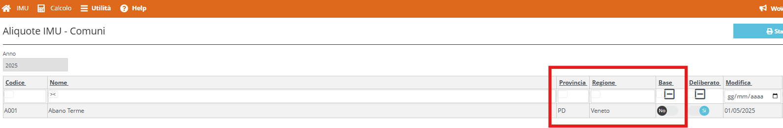 Nell'interfaccia della pagina "Aliquote" sono stati inseriti ulteriori filtri: