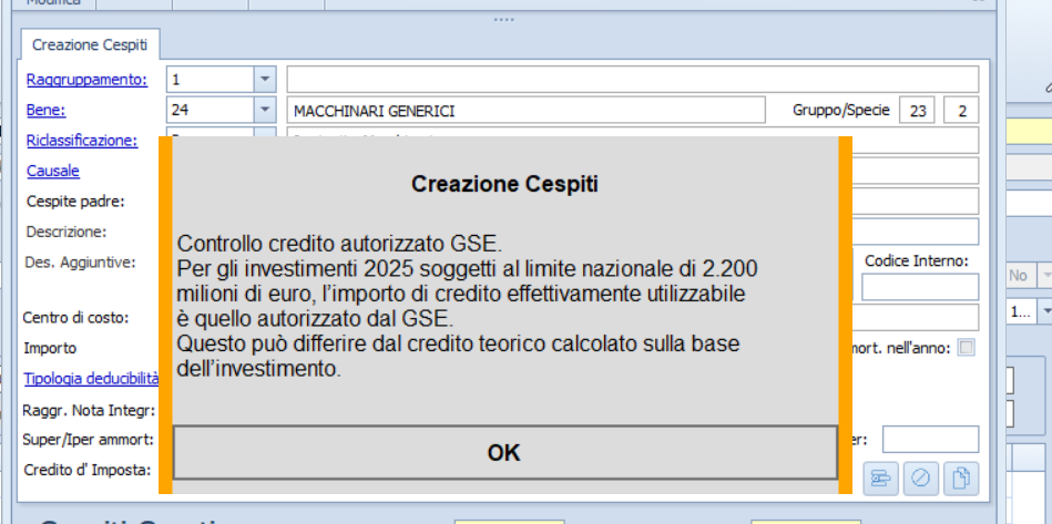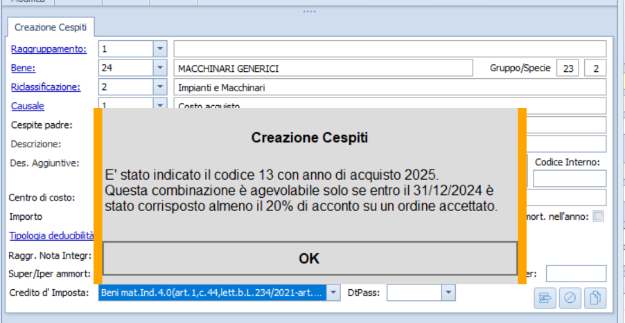 - Il codice “13” per gli investimenti effettuati nel 2025 per i quali risulta versato, entro il 31/12/2024, almeno il 20% di acconto sull’ordine accettato. In fase di caricamento del cespite, se viene indicato l’anno di acquisto 2025 e selezionato il codice 13, il programma visualizza un messaggio che ricorda che tale combinazione è agevolabile solo in presenza di un acconto ≥ 20% entro il 31/12/2024. Il codice tributo da utilizzare è il “6936”, senza limitazioni sull’importo spettante.