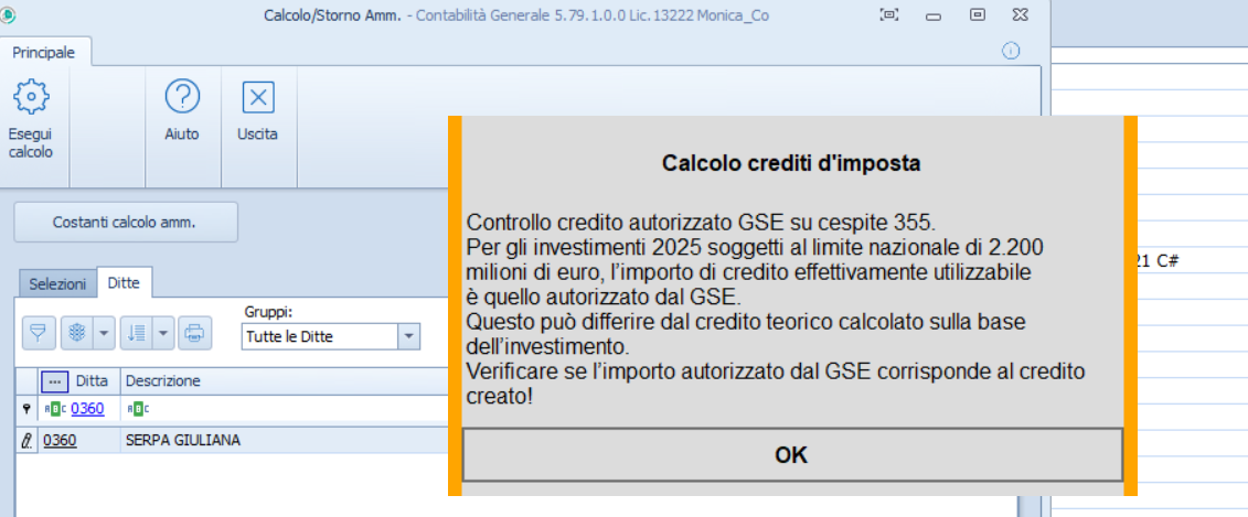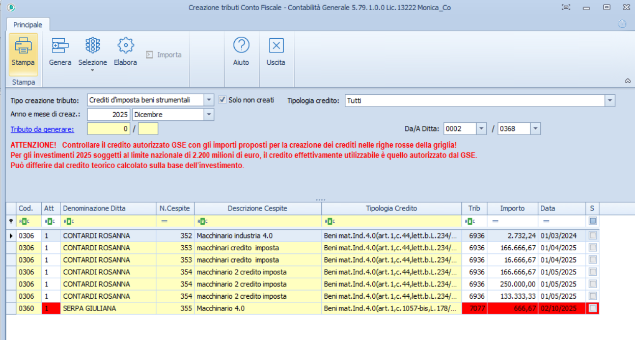 - il codice “17” per gli investimenti effettuati nel 2025 per i quali non sia stato versato alcun acconto nel 2024 e per i quali si applicano le nuove regole di comunicazione al GSE. In questo caso il gestionale ricorda che l’importo del credito effettivamente utilizzabile è quello autorizzato dal GSE, che può differire dal credito teorico calcolato sulla base dell’investimento. Qualora il credito effettivo spettante sia diverso da quello teorico, l’operatore dovrà aggiornare manualmente l’importo del credito, così da calcolare correttamente le rate da riportare nel modello F24. Il codice tributo da utilizzare è “7077”.