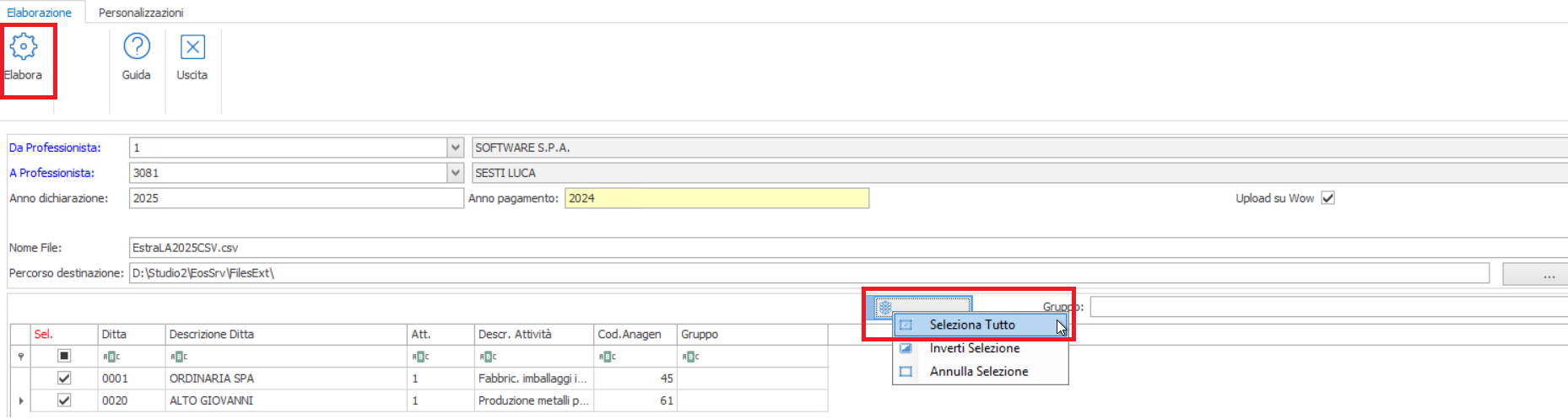 Verrà proposta la seguente schermata con l'elenco delle ditte per cui sono presenti delle ritenute nell'archivio ritenute d'acconto da riportare nella CU 2025. Selezionare le ditte interessate e cliccare su Elabora: