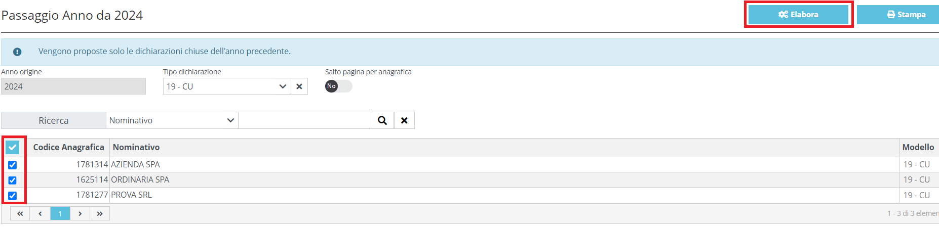 selezionare tutte le anagrafiche proposte nell'elenco e cliccare su Elabora. Al termine dell'elaborazione verrà fornito un tabulato di controllo con il riepilogo dei dati trasferiti tramite il passaggio d'anno.