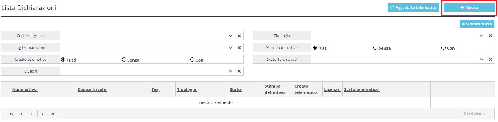 Nella schermata che si apre è possibile usare i filtri proposti per selezionare le anagrafiche per le quali creare la dichiarazione: