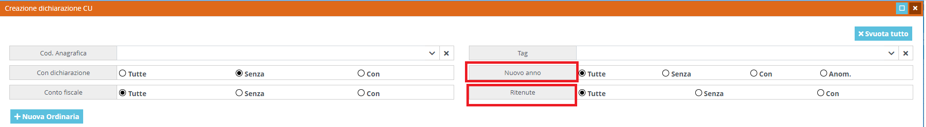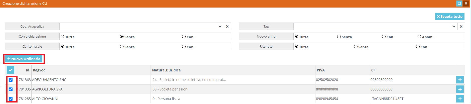 Per creare più dichiarazioni contemporaneamente, selezionare i dichiaranti interessati e cliccare su "Nuova ordinaria":