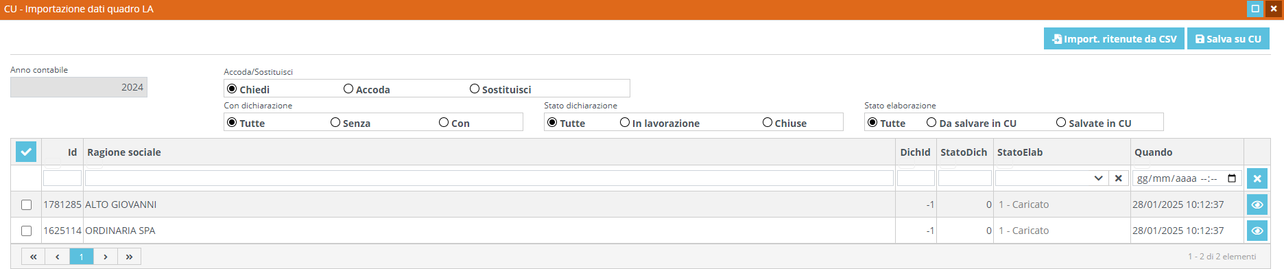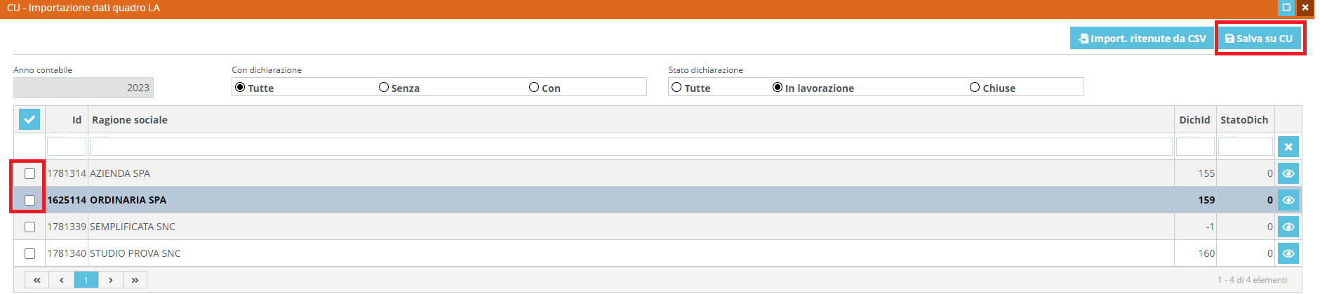 Successivamente, selezionare i dichiaranti interessati e cliccare su "Salva su CU" per riportare le ritenute automaticamente all'interno del quadro LA dei dichiaranti selezionati.