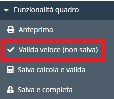 Nel corso della compilazione, è possibile eseguire una validazione veloce dei dati tramite il pulsante "Valida veloce" presente sempre tra le "Funzionalità quadro" (sopra a "Salva calcola e valida"). Tuttavia, i dati non verranno salvati ma verranno mostrate soltanto le eventuali segnalazioni.