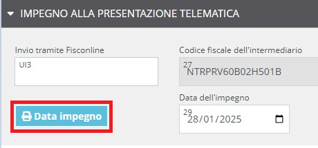 E' possibile eseguire l'accesso anche dal modello della CU stesso, cliccando sul pulsante "Data impegno" nella sezione "Impegno alla presentazione telematico" del quadro DIC della CU.