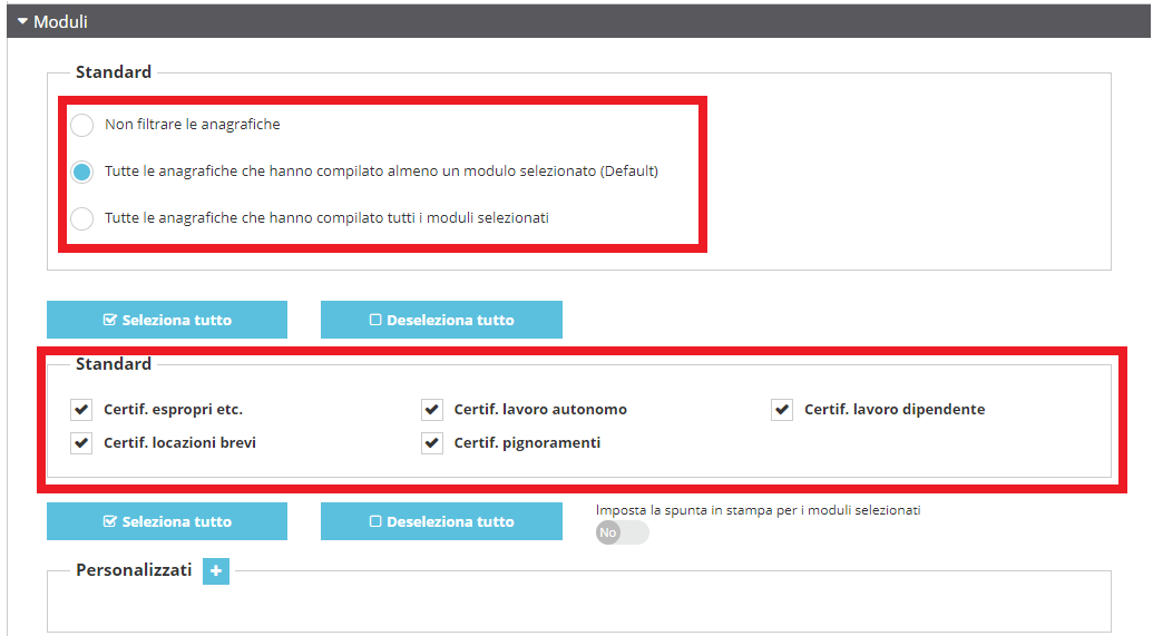- Tutte le anagrafiche che hanno compilato tutti i moduli selezionati: permette di visualizzare soltanto le anagrafiche che hanno compilato tutti i moduli selezionati in questa sezione nel riquadro sottostante.