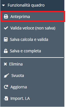 Per visualizzare l'anteprima di stampa di ciascun quadro, dall'interno della CU, cliccare sulla voce "Anteprima" disponibile nella sezione "Funzionalità quadro".