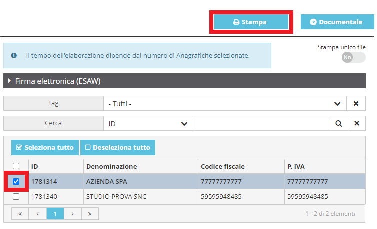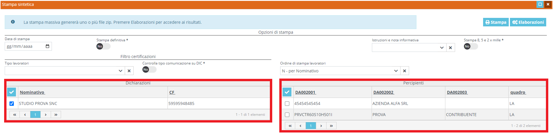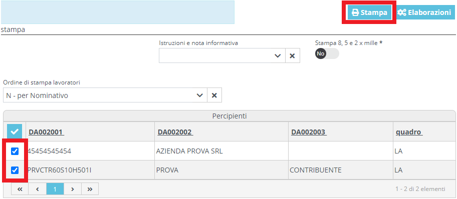 Uno volta effettuate tutte le impostazioni desiderate selezionare i percipienti interessati e cliccare sul pulsante "Stampa" in alto a destra per finalizzare l'operazione.