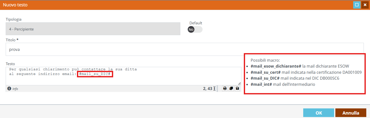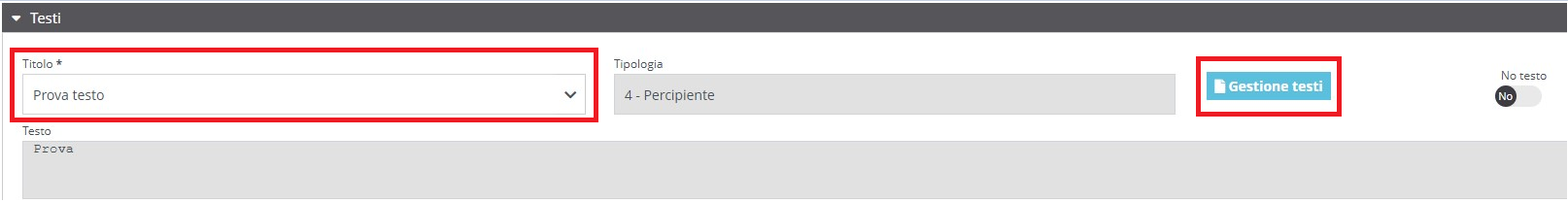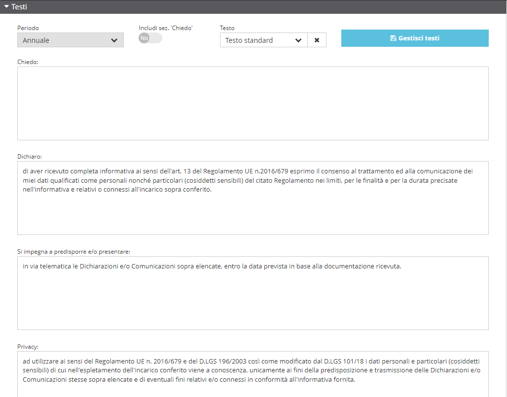 Nella sezione "Testi" sono proposti i testi standard del conferimento incarico. Questi possono, eventualmente, essere modificati laddove necessario.