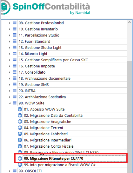 Dopo aver effettuato le eventuali modifiche necessarie, come da indicazioni del punto precedente, si può procedere con l'esportazione delle ritenute. Da Spinoff Contabilità accedere quindi alla voce 98-Wow Suite, 09-Migrazione Ritenute per CU/770:
