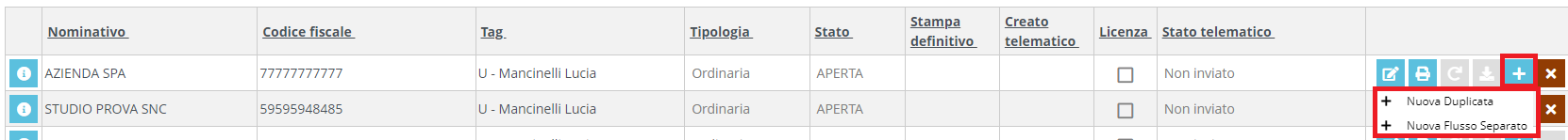 Per generare le tipologie A Flusso Separato e Duplicata, cliccare sul "+" in corrispondenza del dichiarante interessato e scegliere l'opzione desiderata: