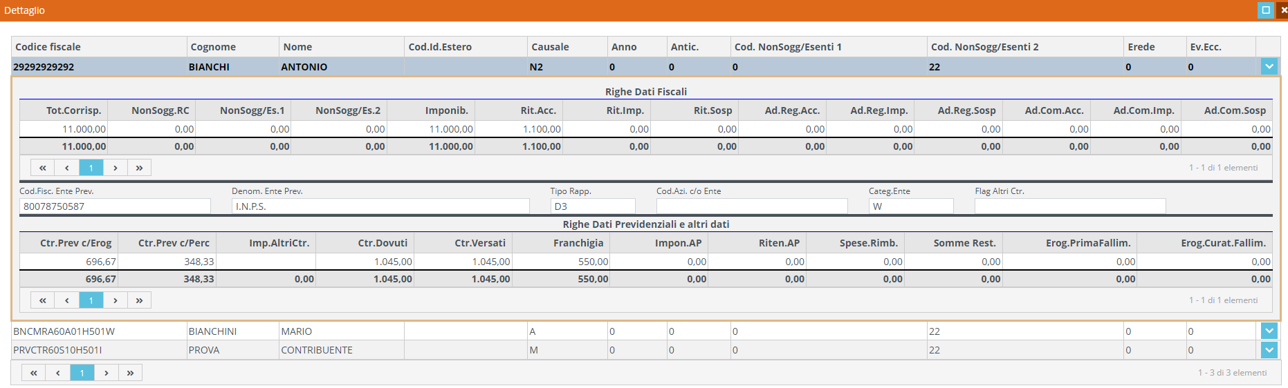 NB: La sezione di dettaglio viene compilata anche nel caso in cui il percipiente non fosse già presente e in questo caso i dati coincidono con il totale.