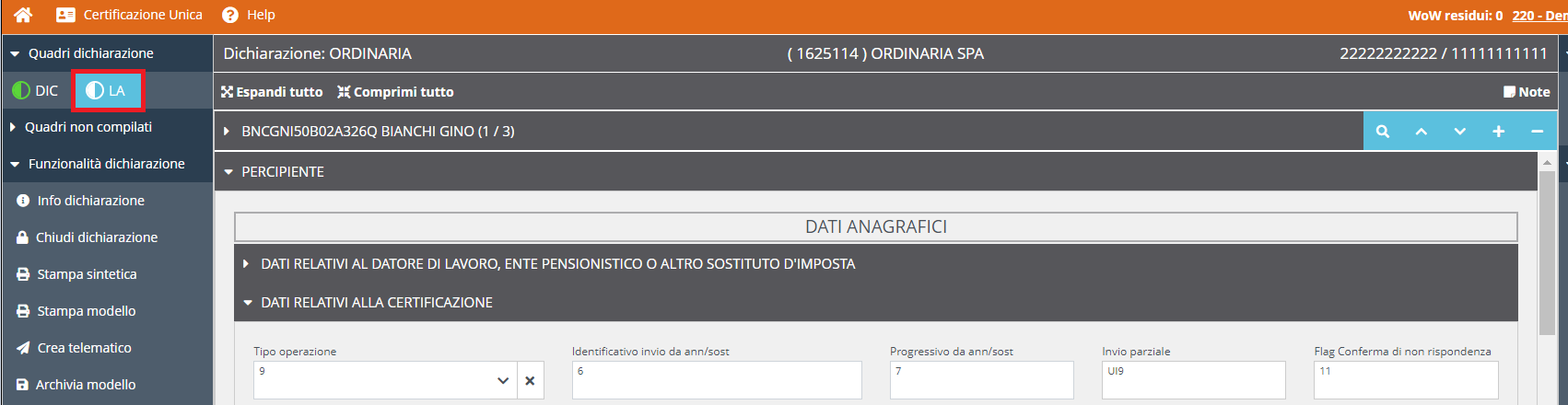 - Accedere al quadro che contiene la certificazione da inviare (per esempio LA);