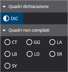 In basso, sulla sezione "Quadri non compilati" sono presenti i quadri non ancora aperti. Cliccando su uno qualsiasi dei quadri, questo verrà spostato nella sezione "Quadri dichiarazione", il corpo del quadro sarà visibile sulla schermata centrale e sarà possibile cominciare la compilazione.