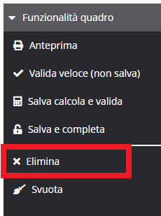 Nel caso in cui sia necessario eliminare il quadro, nella sezione "Funzionalità quadro", in basso a sinistra, basterà cliccare sul pulsante "Elimina". Così facendo, il bollino del quadrò verrà riportato nuovamente nella sezione "Quadri non compilati".