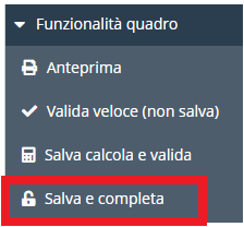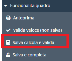 Una volta compilato il quadro, prima di uscire, è sempre necessario cliccare il pulsante "Salva calcola e valida" nella sezione Funzionalità quadro, per salvare e validare i dati inseriti.
