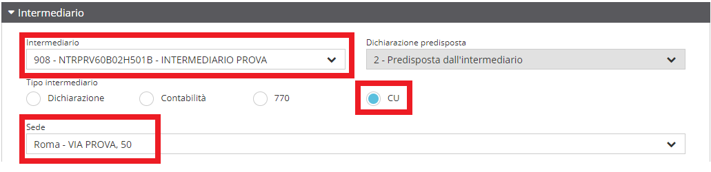 Nella pagina che si apre, selezionare l'Intermediario, apporre il flag su "CU" e selezionare la sede intermediario.