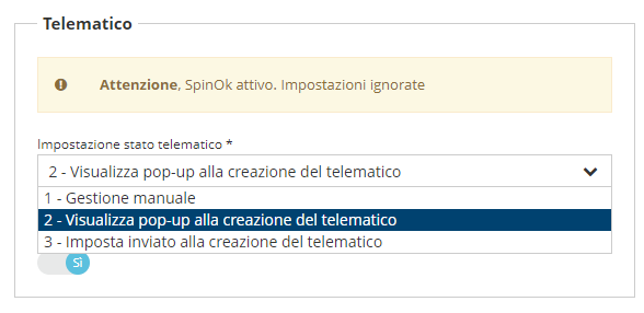 - Visualizza pop-up alla creazione del telematico: viene mostrato un pop-up con la possibilità di scegliere se aggiornare o meno lo stato alla creazione del telematico;