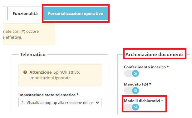 - Nella TAB "Personalizzazioni operative" abilitare su "Sì" il campo "Modelli dichiarativi" nella sezione "Archiviazione documenti".