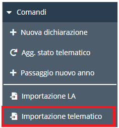 L'importazione da file telematico è disponibile dalla pagina di elenco delle certificazioni alla voce "Importazione telematico" dalla sezione "Comandi" sulla sinistra della pagina.