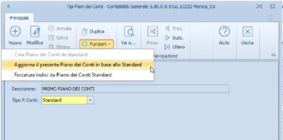 Cliccare su funzioni " Aggiorna il presente Piano dei Conti in base allo Standard"