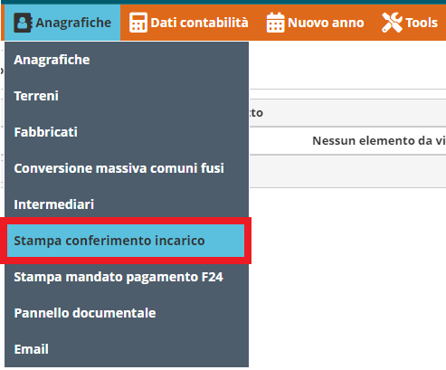 Per effettuare la stampa del conferimento incarico, nel Manager posizionarsi sulla voce "Anagrafiche" e selezionare la voce "Stampa conferimento incarico" nel menu a discesa.