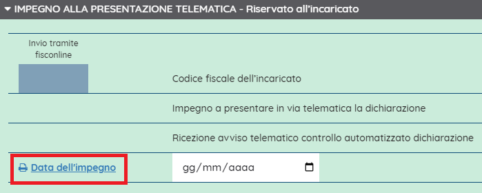 E' possibile eseguire l'accesso anche dal modello della CU stesso, cliccando sul pulsante "Data impegno" nella sezione "Impegno alla presentazione telematico" del quadro DIC del 770. In tal caso al rientro nel quadro sarà necessario ricaricare la pagina per vedere la data impegno aggiornata.