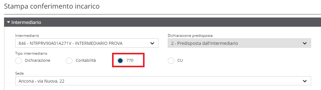 Nella pagina che si apre, selezionare l'Intermediario, apporre il flag su "770" e selezionare la sede dello intermediario.