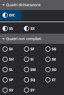 Una volta all'interno della dichiarazione, sulla sezione di sinistra "Quadri dichiarazione" sarà possibile visualizzare i quadri già aperti. Inizialmente sarà aperto soltanto il quadro DIC (Frontespizio) e i quadri di riepilogo SS ed SX.