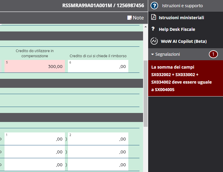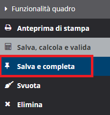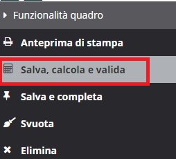 Una volta compilato il quadro, prima di uscire, è sempre necessario cliccare il pulsante "Salva calcola e valida" nella sezione Funzionalità quadro, per salvare e validare i dati inseriti.