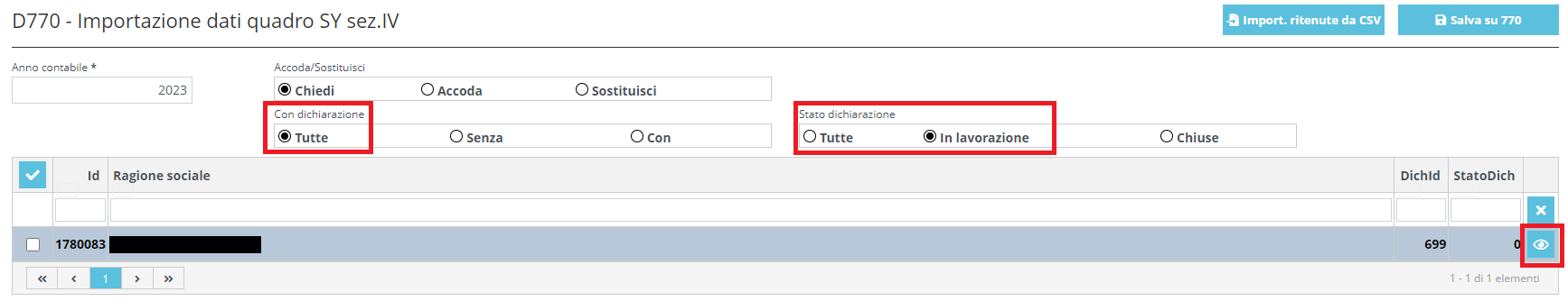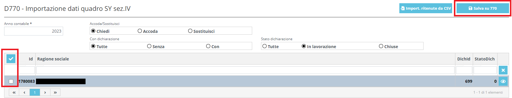 Successivamente, selezionare i dichiaranti interessati e cliccare su "Salva su 770" per riportare le ritenute automaticamente all'interno del quadro SY sez. IV dei dichiaranti selezionati.