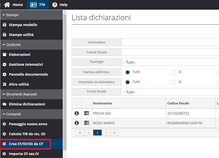 Tramite la scelta "Crea ST/SV/SX da CF" presente sul menu di sinistra della lista dichiarazioni 770 è possibile accedere alla creazione dei suddetti quadri da conto fiscale.