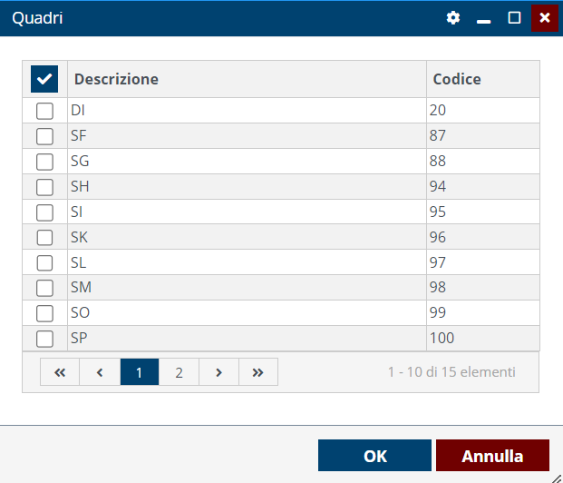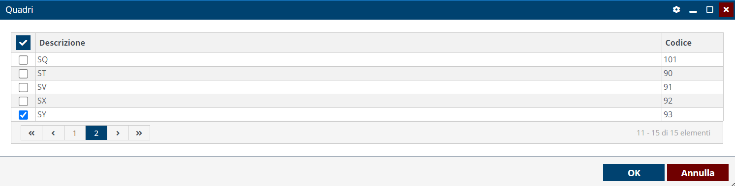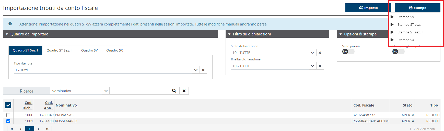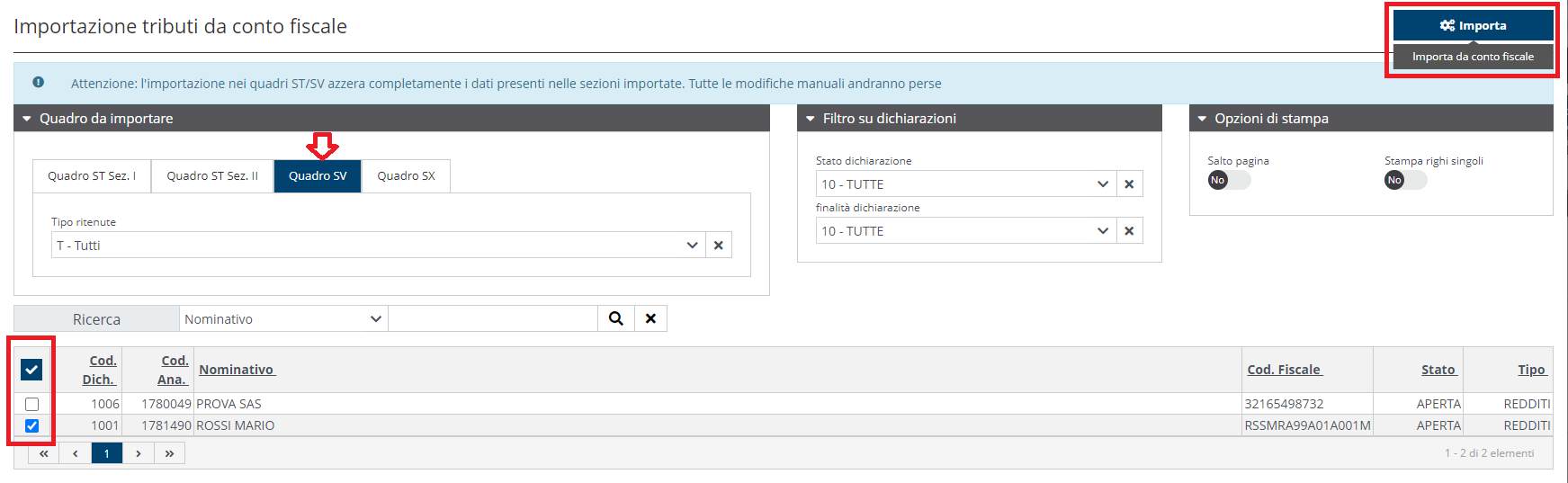Nella sezione quadri è anche possibile selezionarne solo alcuni per stampare solo determinati quadri per più dichiaranti. La stampa in questo caso è sempre in bozza.