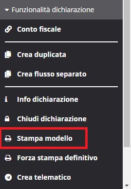Per fare ciò sarà necessario posizionarsi sulla pagina di elenco delle dichiarazioni e nella sezione "Stampe" e scegliere "Stampa modello". Quindi selezionare i dichiaranti interessati filtrandoli eventualmente tra dichiarazioni Chiuse o ancora aperte o altri filtri e procedendo quindi alla stampa definitiva o in bozza.