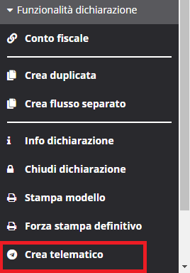 Una volta chiusa e stampata la CU, per la creazione del telematico cliccare sulla voce "Crea telematico" sempre tra le "Funzionalità dichiarazione".