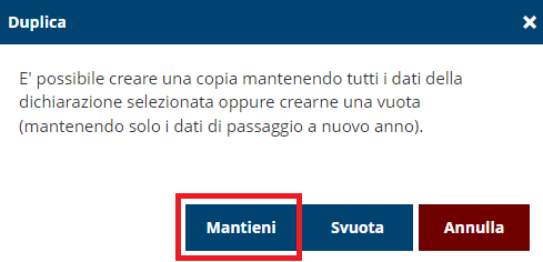 Quindi dalla lista dichiaranti premere sul pulsante corrispondente e rispondere "Mantieni" al seguente messaggio che si presenta nel caso di duplicata (nel caso di integrativa è implicito e i dati vengono mantenuti).