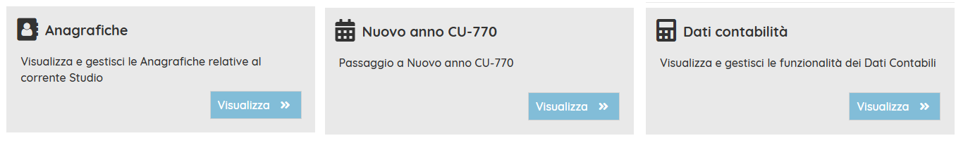 Per accedere invece alla parte di Gestione Anagrafiche, Gestione dati contabilità (tra cui le ritenute esportate da Spinoff, e per effettuare il passaggio d'anno cliccare sulla voce "Manager" e in seguito su "Visualizza", in corrispondenza del modulo desiderato ("Anagrafiche" "Passaggio anno CU-770" o "Dati contabilità")