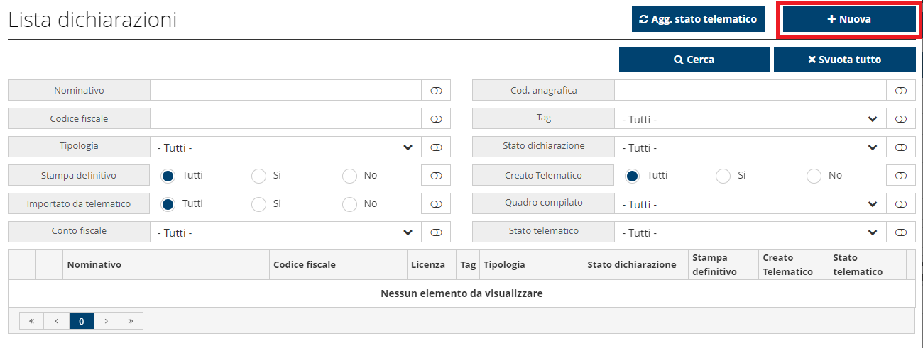 Nella schermata che si apre è possibile usare i filtri proposti per selezionare le anagrafiche per le quali creare la dichiarazione: