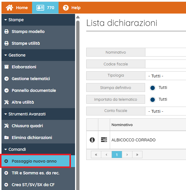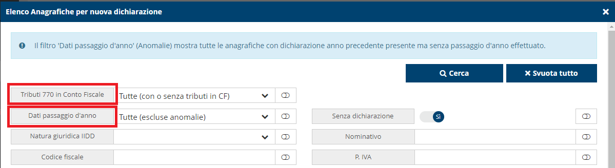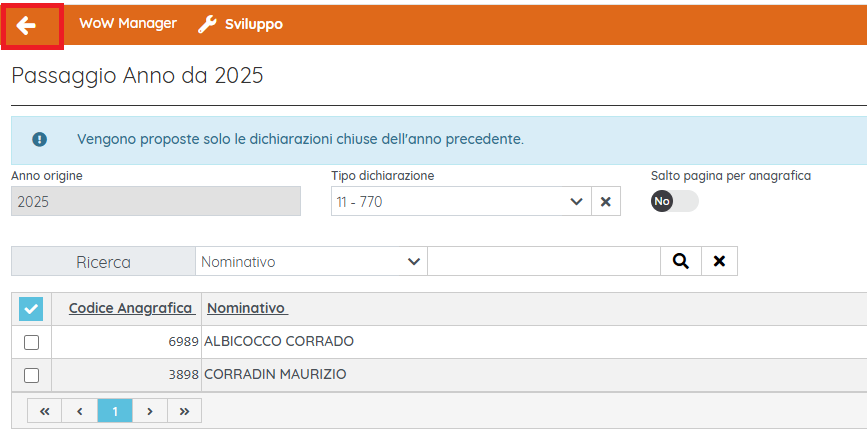 - Dati passaggio d'anno: scegliendo opzione su "Anagrafiche con passaggio" vengono proposte le anagrafiche dei dichiaranti per cui è stato eseguito il passaggio a nuovo anno