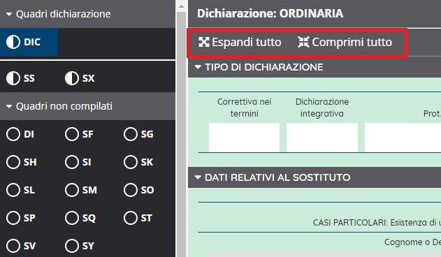 Come sopra spiegato, il corpo del quadro si trova nella schermata centrale. Questo si suddivide in sezioni che che possono essere espanse o compresse sia singolarmente (cliccando sul titolo di ogni sezione) sia massivamente tramite i pulsanti "Espandi tutto" o "Comprimi tutto".