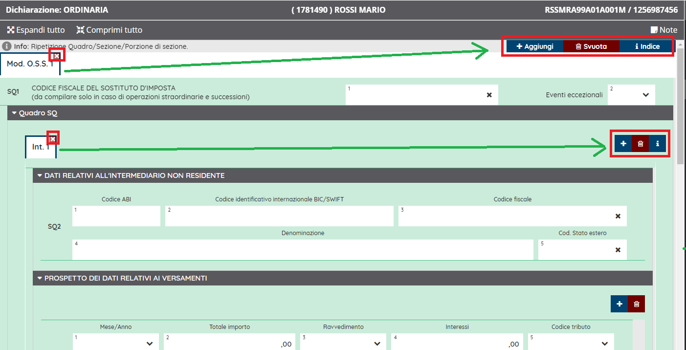 In quasi tutti i quadri, in alto a destra sono presenti alcuni comandi che permettono di aggiungere nuove pagine (chiamate "Mod. OSS") per la gestione della dichiarazione dei soggetti estinti incorporati per Operazioni societarie Straordinarie ma, di norma, queste vengono create automaticamente dalla funzione di Importazione della dichiarazione del soggetto Estinto in quella del Cessionario.