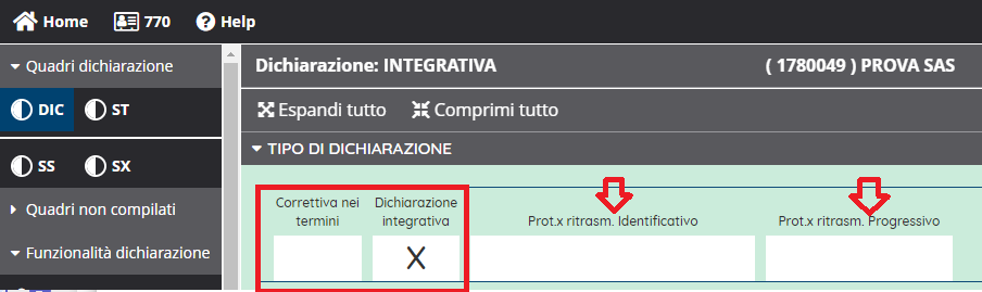 Accedere alla dichiarazione e al quadro DIC, impostare il tipo di dichiarazione e il protocollo di ritrasmissione che va sempre indicato, sia nel caso di correttiva che di integrativa, sia che si invii la dichiarazione in un unico flusso che in flussi separati.
