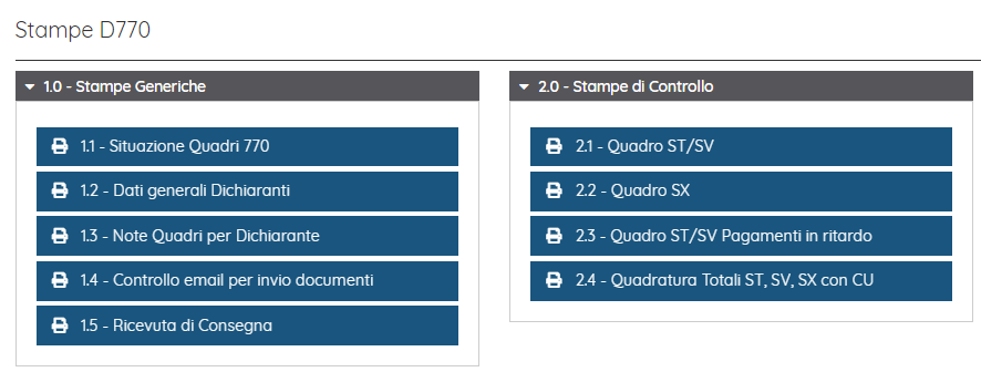 Finché non si esce dalla maschera tutte le stampe dei quadri creati sono recuperabili dal pulsante stampe. Vi preghiamo di stamparli e conservarli per agevolare i controlli di quadratura.