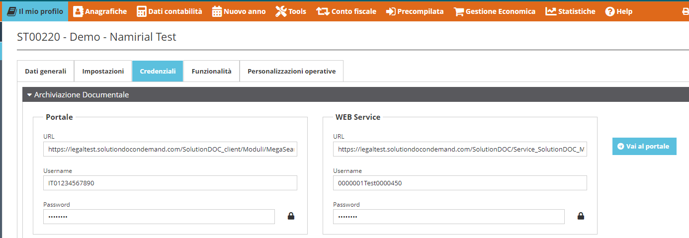- Configurare le credenziali e i codici ricevuti al momento dell'attivazione del modulo di archiviazione e conservazione di SpinDoc all'interno del "Manager > Il mio profilo > Credenziali" all'interno della sezione "Archiviazione documentale";