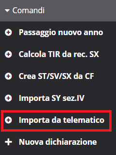 L'importazione da file telematico è disponibile dalla pagina di elenco delle dichiarazioni 770 alla voce "Importazione telematico" dalla sezione "Comandi" sulla sinistra della pagina.